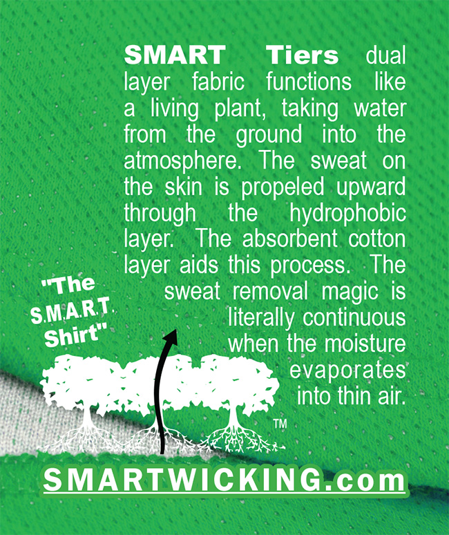 DRYWICKING: This is achieved by our patent pending knitting process, whereby sweat is mechanically propelled away from the skin and into a distinct second layer. The first soft tier uniquely keeps the skin dry without the use of chemical treatments. Our soft silky inner fibers provide extreme comfort, no more sogginess, and a dry non bacteria growing microclimate. The outer layer, designed for maximum evaporation and transfer, dries quickly preventing condensation and odors caused by lingering sweat. This resilient fabric combination has the added benefit of insulation without causing the body to overheat or cool too quickly when your exertion level varies or different outside temperatures are encountered. SMART Tiers' revolutionary process is self contained in one fabric that is soft, comfortable, durable and will not pill. Our dimensionally stable dual layer fabric will maintain its fit and finish indefinitely.